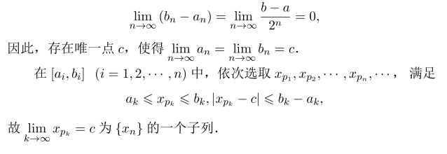 证明:设数列{xn}有界,则存在a,b,使得对于任意的自然数n,有a≤xn≤b,将[a,b]二等分,其中至少有一个区间包含有数列{xn}的无限多项,记为[a1,b1],再将[a1,b1]二等分,将含有{xn}无限多项的区间记为[a2,b2],···,得到一闭区间列,且