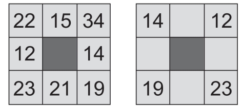 第一个格子里的数字顺时针旋转后,数字的位置如第二个格子所示。那些缺少的数字应该在什么位置?