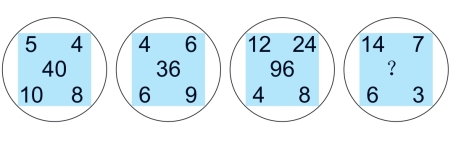 根据前面三个图形中数字出现的规律,推断第四个图形中间的问号处应该是什么数字。