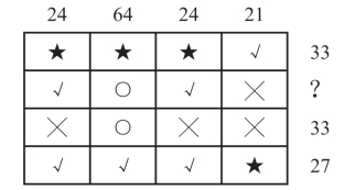 格子中的每一种标志都代表了一个数字,格子上边和右边的数字则代表了该列和该行的数字和,你能算出问号所代表的数字吗?