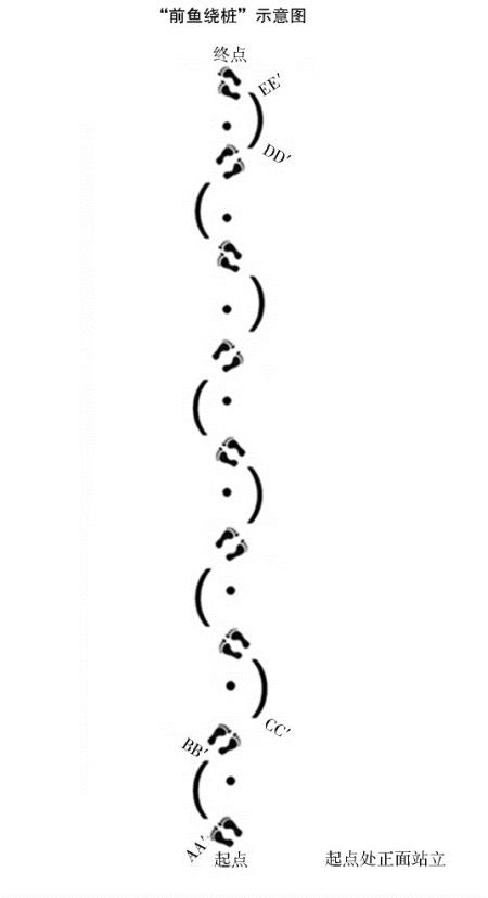 2.学生双脚平行(斜角)站立。(见“前鱼绕桩”示意图)