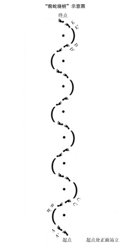 8.学生双脚一前一后(斜角)站立。(见“前蛇绕桩”示意图)