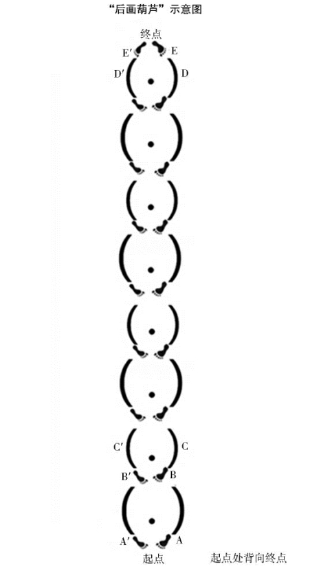6.第二个学生开始“后画葫芦”,画至第一个桩杯的位置(裆部正好在第一个桩杯的正上方)。此时,第一个学生应正好移至第二个桩杯的位置(裆部正好在第二个桩杯的正上方)。
