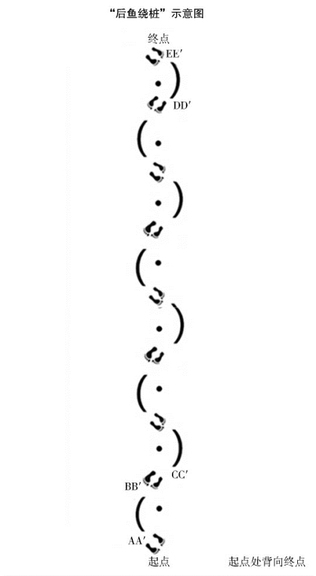 2.学生双脚平行(斜角)站立。(见“后鱼绕桩”示意图)