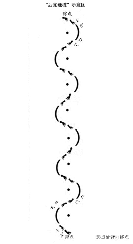 8.学生双脚一前一后(斜角)背身站立。(见“后蛇绕桩”示意图)