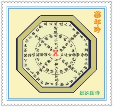 由蜘蛛抽出八根经线,每根经线由七个字构成。网的外边是八边形,经线在边的中央,经线的两端各1字。在经线的第四字位置上是网的第二圈,两经线间含2字。