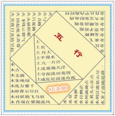 五杂俎,外一正方形,连接四边的中点,在正方形中又成一个正方形,在这个正方形中,连接对边的中点,这条线的两端分别与另一条边的中点连接,得一个三角形。如此图中出现五个一样大的三角形,这五个三角形用宝塔诗的方法构成八层,五个宝塔每层的顶字为五行字,读时按五行次序进行,五行字既是题目,又在每行的头上,充当与后面一字组字的偏旁,因此每首诗有七个同部首字。读法按从左读再右旋,再左旋,再右旋地读下去。