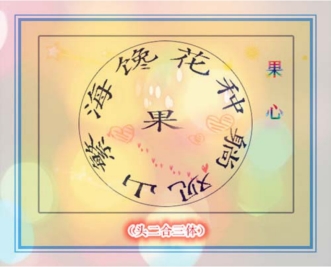 花心诗,中心是花便叫花心诗,是果便叫果心诗,随中心字命名。五言诗一首,从顶上开始,顺时针转,第一个字读成离合字,再与中间的字连线读到对面。实际是头二合三体,每句的第一二字合成第三字。