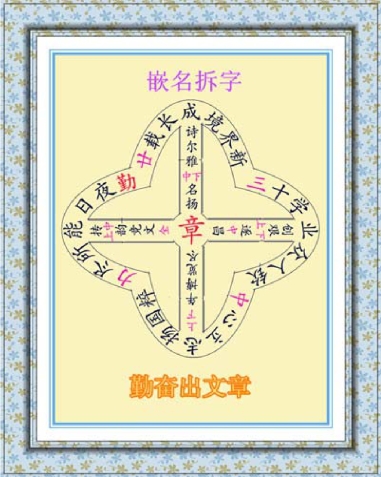 拆章勤二字(章勤为学弟名)。外圈为圆盘拆字体,内盘为镜蒂体拆字。