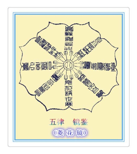 菱花镜,菱花镜形状。每句第一字是艸字头,象镜背文。句尾一字皆有八字,象菱花边,从中间的圆上发射出八根线,每根五字,得五言律一首,正南读起,逆时针读。如果每根七字,则得七言律一首。诗句的首字都为草头,诗句的尾字最后两笔是八字。