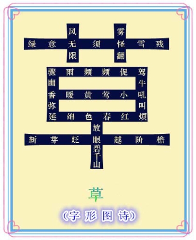 读法:按笔顺读,但日字的读法要由骤到驾再到烦再到延,然后回到骤,再从香到吼。用半字顶真法,这几句的首字是上句尾字的半字。读得长短句一首。