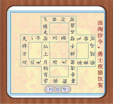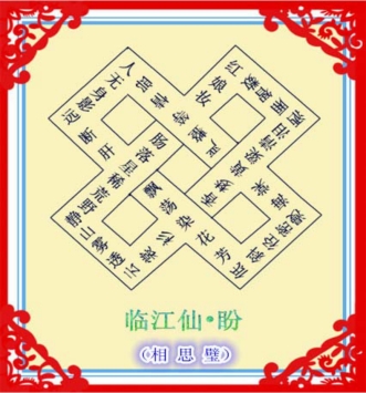 相思璧,图为相思璧形,字数上可灵活一点,因此有44字的、50字的、52字的三种,构成的10句半字顶真回环诗词,读出的词分别为54字、60、62字。从北面那个方形的顶着线的字读起,只读半个字,这个整个的字则留给词尾。句子不能一口气读下去,转两弯遇到横线前一字则停,下一行又顶上横线去读。