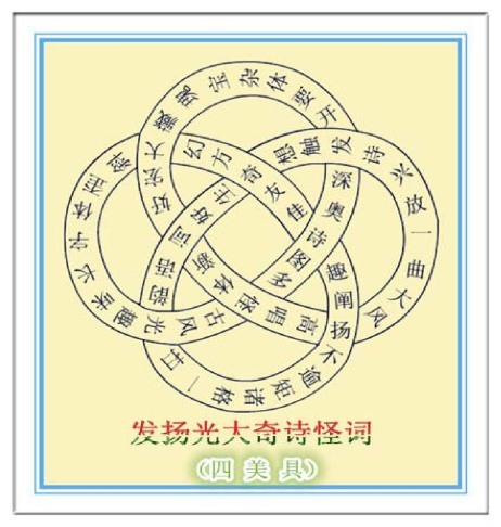 十七字诗四首,内交互处为“奇诗怪词”,外交互处为“发扬光大”,彼此借读。从“奇”字起,顺时针转。