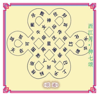 古名“月桂交枝”,田字图上有两圆四弧,交接字九个(公用字),从顶上中间交接字顺横线逆时针读。字数可灵活安排。