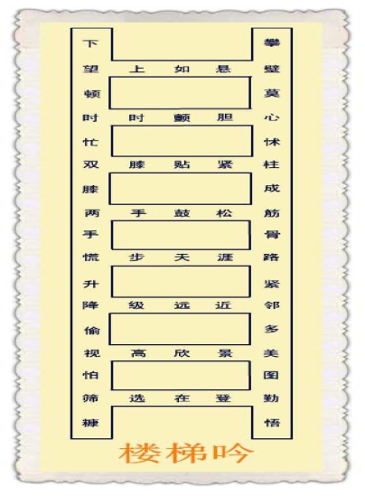 十七字诗两首(两边),五律一首(中梯级),交接处为公用字。
