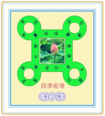 四方大塘一个,每边四字。四角各有一个小圆,每圆也是四个字,四角的春夏秋冬四字是公用字。从“春”顺时针读圆起。