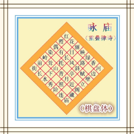 正方形,似棋盘,49格,实际字数40个,交接点16个(公用字),横竖各四句七言,读得七律一首。