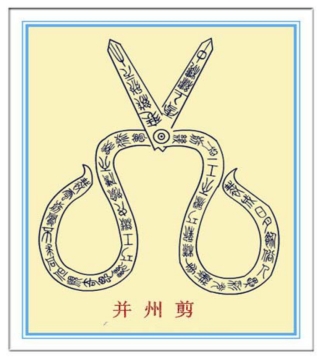 并州剪,剪刀形,七言绝句两首,中回字像钉铰,做公用字。句尾的中字巾字像剪之尖。