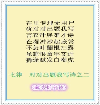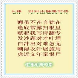 藏头拆字体再加特殊的一字韵(独木桥体),一般的独木桥体只用一个韵字,特殊的独木桥体用一个音(包括声调),却用不同的字,比一般的独木桥体更难写,但更活泼。