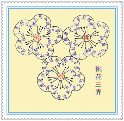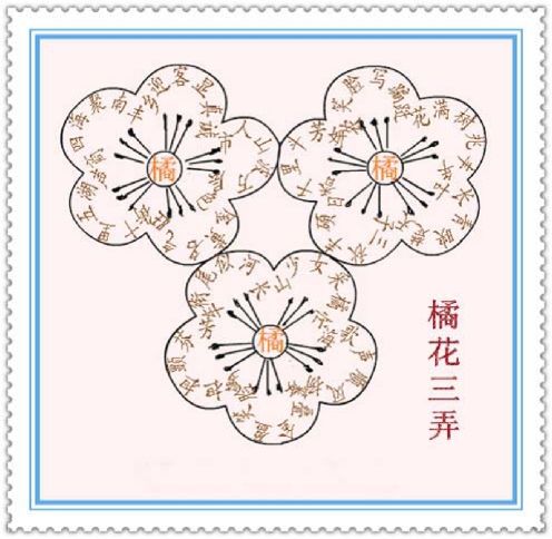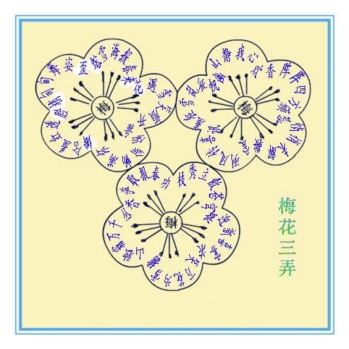 这里的梅花三弄是同头诗,图共有三朵梅花,每朵梅花构成诗一弄(五句一首)35个字。一朵梅花五瓣(五个圆)由31字组成,中心一字即题目,两圆之间公共合用3字(包括圆心的那个字),这样每瓣梅花由9个字组成。每句诗都由中心那个字开始,组成同头五句七言诗三首。1245句押韵。可看做是一首摊破七绝。