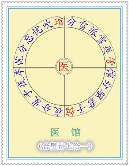 (1)同头,每句开头为医字;(2)药名诗,含雪莲、使君子、子夜车、忘忧;(3)复字诗,句句有分字;(4)重字诗,每句有相同的字,第一句的雪,第二句的馆,第三句的夜,第四句的忧;(5)嵌名诗,嵌“雪君子忧”,雪君子为网名;(6)同音字韵诗,押韵都是管音;(7)同声旁诗(半独木桥体),每个韵字都用官做声旁。