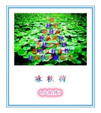 迂回诗,又名曲径诗,通常叫火焰体诗。从形式上说是文字塔的一种。一般的文字塔从上读到下,而它的读法:从左下角的首字开始向右读,读完再向上由右到左(以此类推)至最上面的字。从写法上说,是同头复字诗,共十二处,每句含三字。它在每句中出现,最多有三次(六七层),四五层有两次,二三层各一次。排法,七绝诗的第一行为塔的底,从左排到右,正好七个字,第二句诗为塔的第二层,注意,这时是从右排到左,排六个字,然后第三层,从左排到右。这样左右交替,每层少一字,直至第七层。