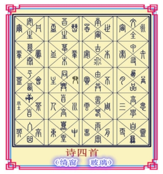 绮窗,20格(横4竖5),每格按东南西北位置安4字,这样直行5字的有8行,10字的4行,皆小篆字体。从右边头上读起,得五言绝句四首。