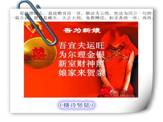 有结婚的么,我这赠喜诗一首,横读为五绝,竖读为四言一句的一篇吉词,题目是藏头。