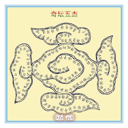 五云,中心一朵云,四周各一朵云,一朵云一首七绝,读时由外向内旋。其中有一种是回文型,五首七绝加回文(读时先由外向内旋,读完后再由内向外旋)。便是十首了。内容最好与云要有些关系。图与诗没有内在联系的,多属于游戏之类。