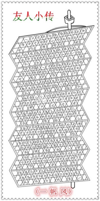 一帆风,图为船帆形。由十片帆布组成。每片有斜写文字,三字或二字一行。每片层中末字均为风字。故斜曳读十首俱用风字结尾。末行编第一至第十号,正好为每首第四句第五字的嵌数。