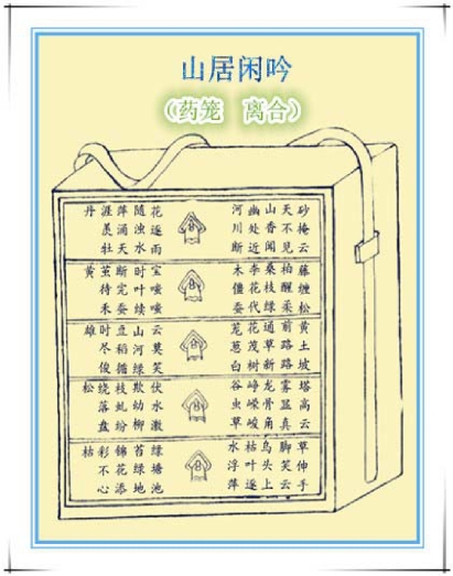 排成药箱形状,五栏文字,每栏竖行。共十行,每行三字,末行只一字。共二十八字。读时一层层由右往左读,每栏文字竖行三字顺读,一首一层。每栏文字可组成七绝一首。可用各种手法构诗,如 离合,回文,镶嵌,回环。离合体是每句句末与下句首字都合成药名,有的连诗末与诗首也合成药名,便成为回环诗。