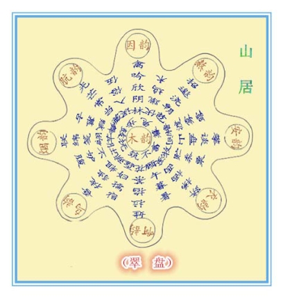 读法与珠盘略异,每句都是由圆心向外读并且是按词(两个字)节奏读,不可按字连贯读下去。