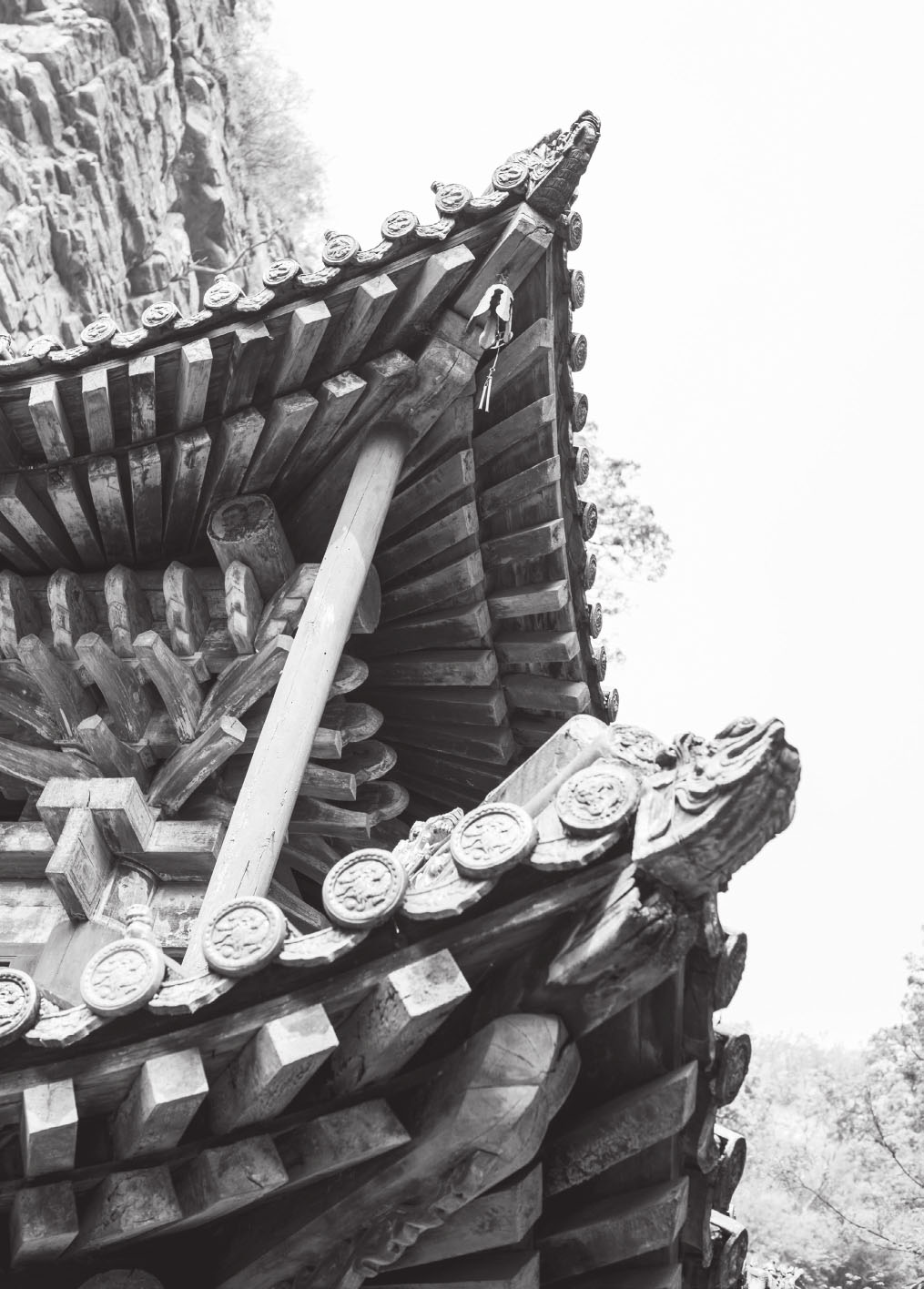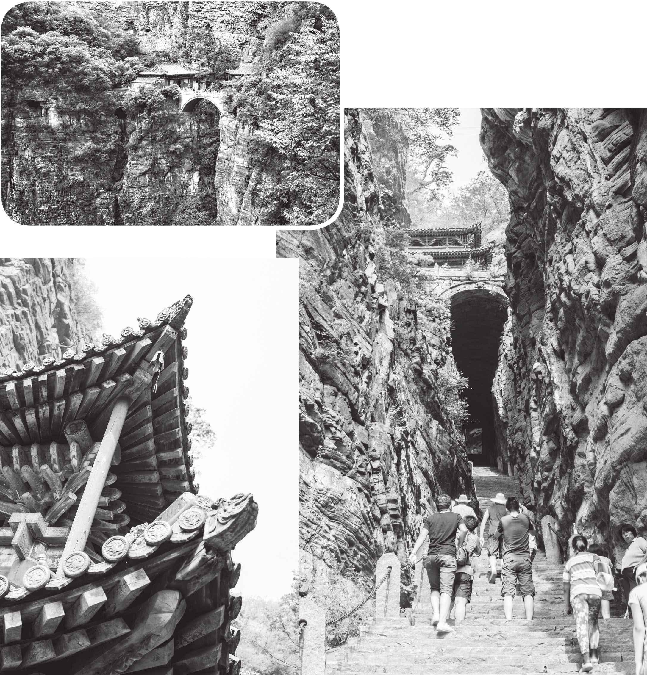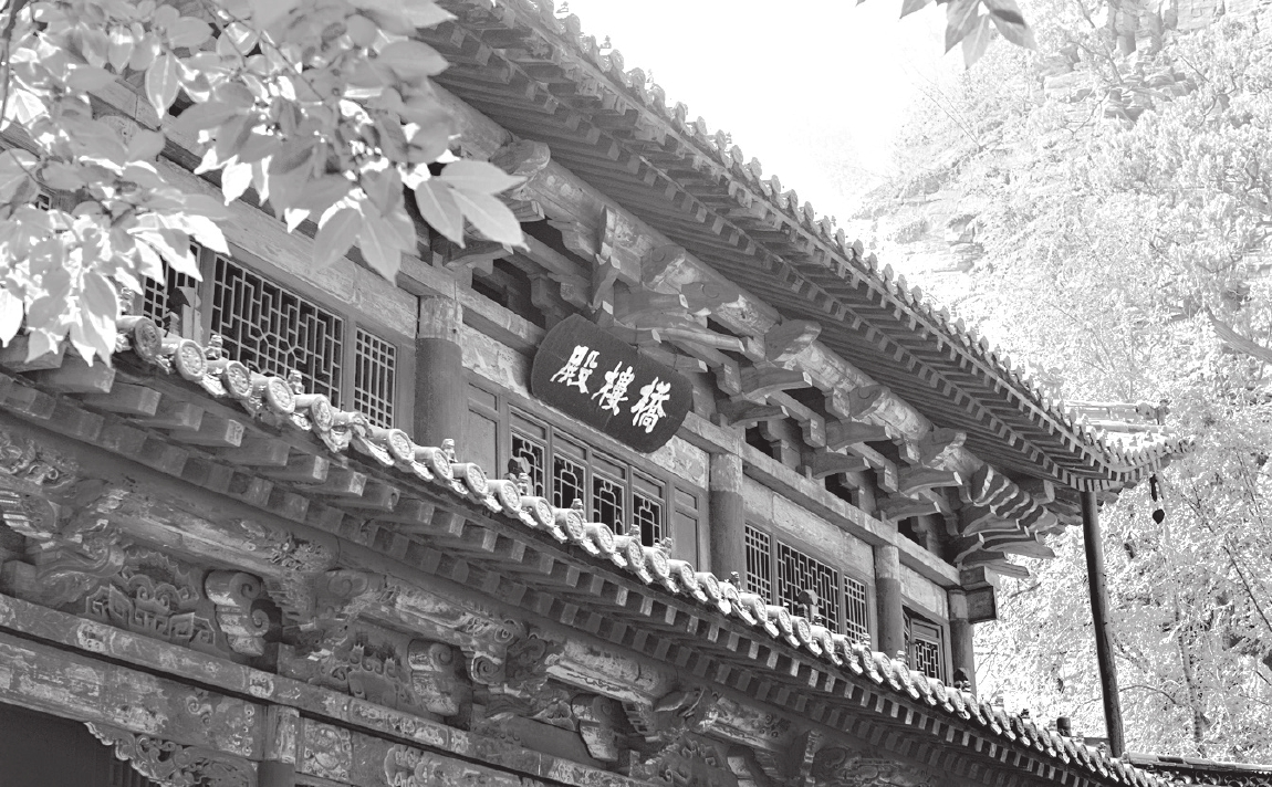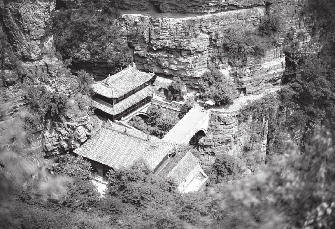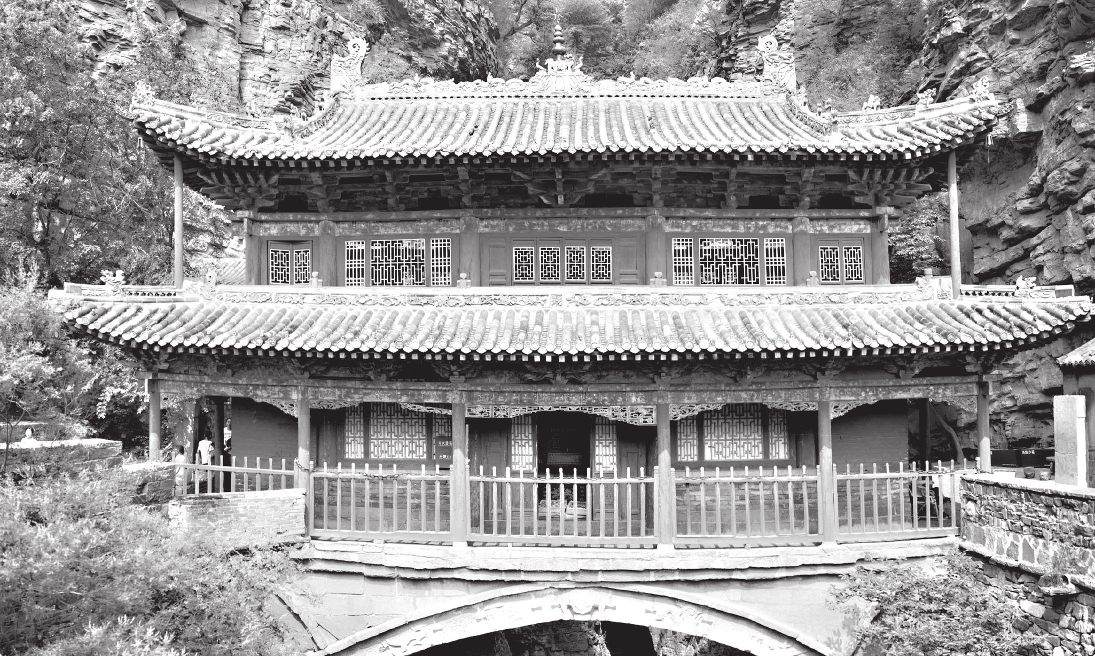 桥楼殿,殿内有壁画,梁枋施彩绘,金碧辉煌。桥下为一长涧,有石蹬360多级。从涧底仰望,青天一线,桥楼凌空,宛如彩虹高挂,故称“桥殿飞虹”。更令人称绝的是,由于空中彩虹流动,好似桥殿也在跟着飘动。站在桥上凭栏俯视,百丈断崖,其势撼人;涧底游客,高不盈尺。桥楼殿将涧、桥、楼、殿融为一体,天趣与人工相结合,达到了完美的境地。
