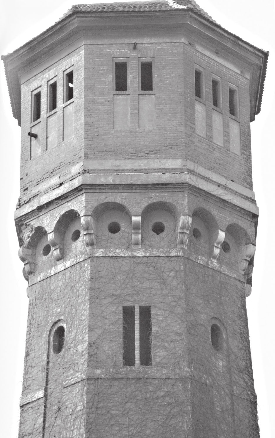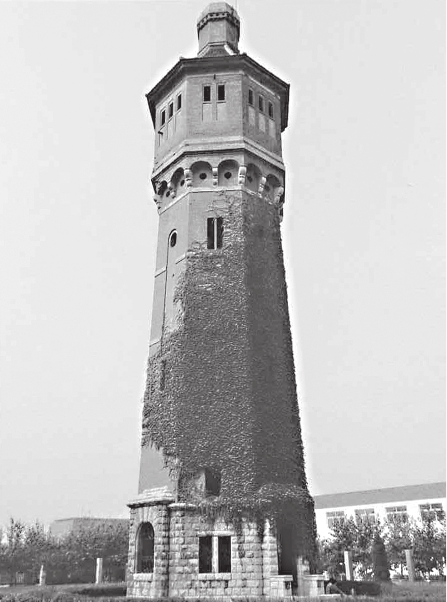井陉煤矿皇冠塔位于河北省井陉县井陉矿务局机关院内,因整体造型酷似皇冠状而得名。该塔始建于1915年,由德国人设计,高36米,占地38平方米,砖石结构,塔身外形为八面体,内部结构分为内外两层,内层走烟,外层有螺旋式台阶,八面开有20个窗口。塔基及底层由青石砌成,设有石拱券门窗。塔顶上部突出部分为水塔,可容水50立方米。主要为老井(南井)工业锅炉排烟提供生产用水。塔顶底沿由16块上大下小的石鼓组成,呈力士状将其托起,形成16孔小拱券,该塔设计精巧,结构奇特。