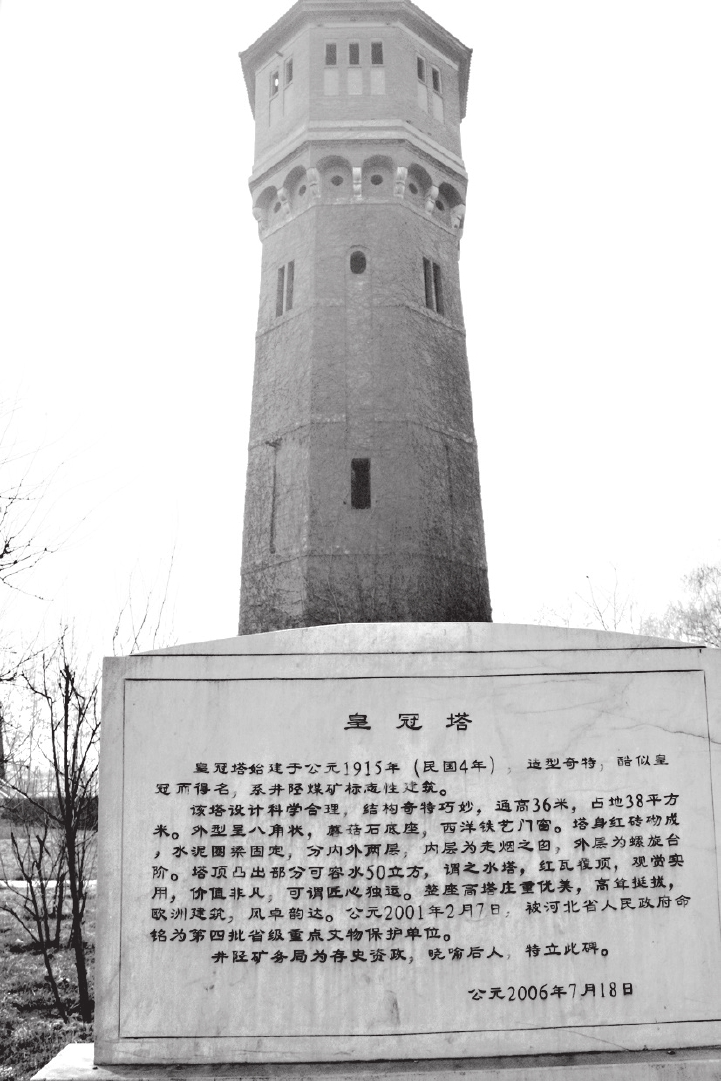 井陉煤矿皇冠塔是近代历史上最早的外国建筑之一。清光绪二十四年(公元1898年),井陉县南正村文生张凤起经县属批准拟动工开办煤矿,因其资金匮乏,1898年在天津与时任北洋海军提督的德国人汉纳根订立中德试办井陉煤矿草约,1902年获清政府路矿总局批准。1903年11月开凿老井,次年6月出煤,使用了77年,于1980年10月关闭。该塔为河北省文物保护单位。