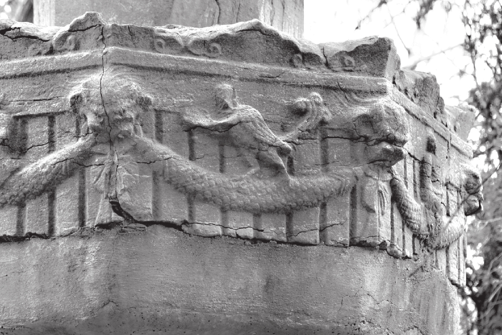 “琛公和尚之塔”,青石质,分八层,中间隔八角八面体兽首、佛像人物浮雕垂幔,下层石柱刻有“琛公和尚之塔”铭文,只有“大定十六年五月六日立”字体隐约可辨。五座石幢造型各异,设计奇巧,布局合理,雕刻精细,保存完好,具有极高的考古价值。