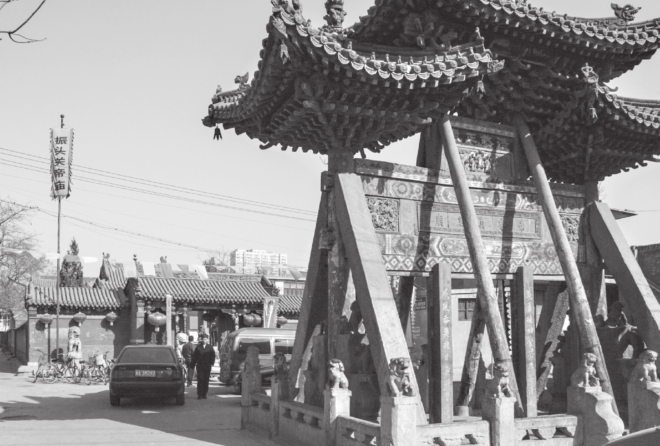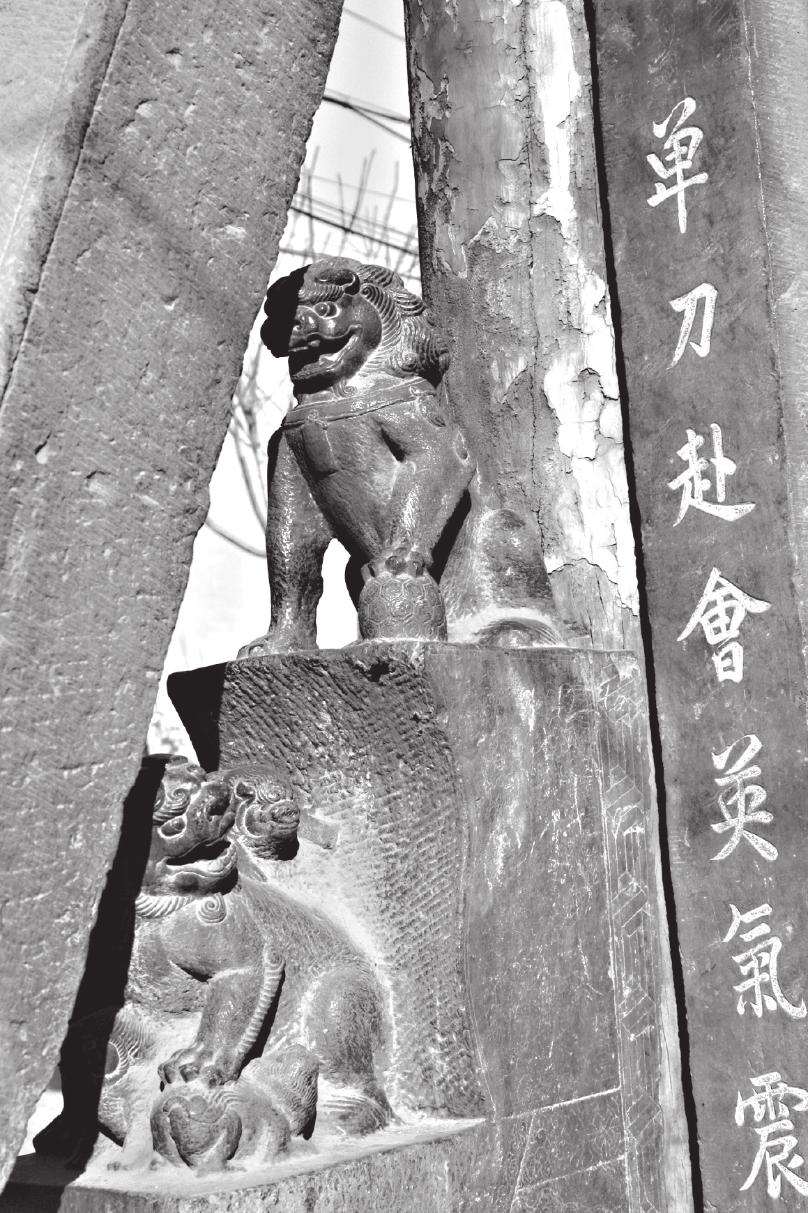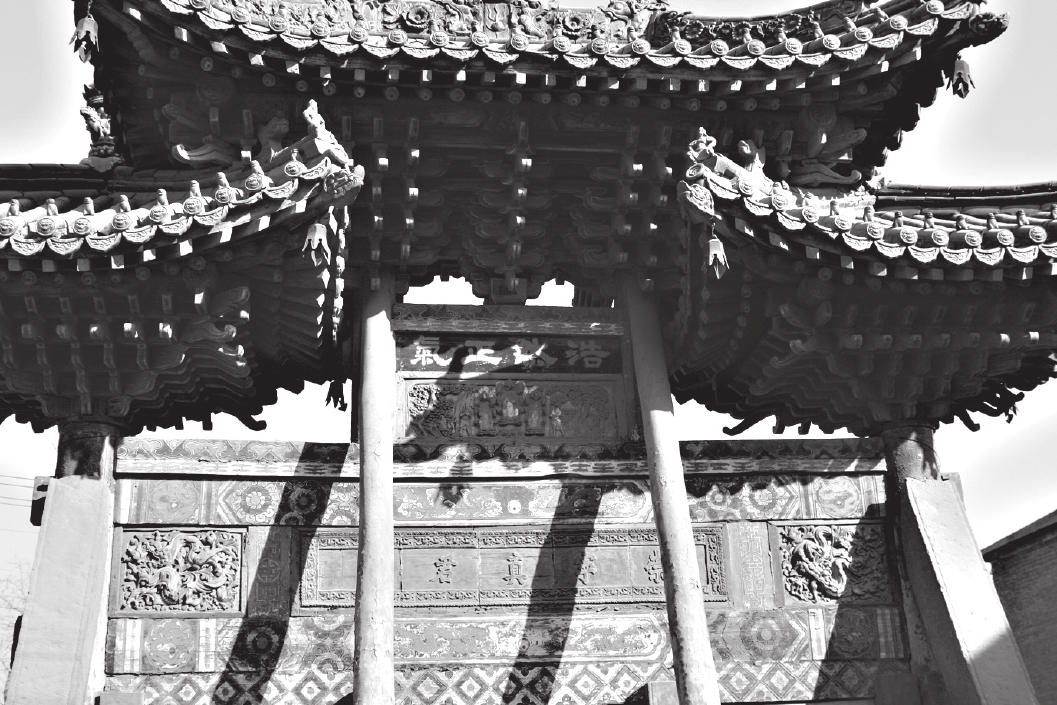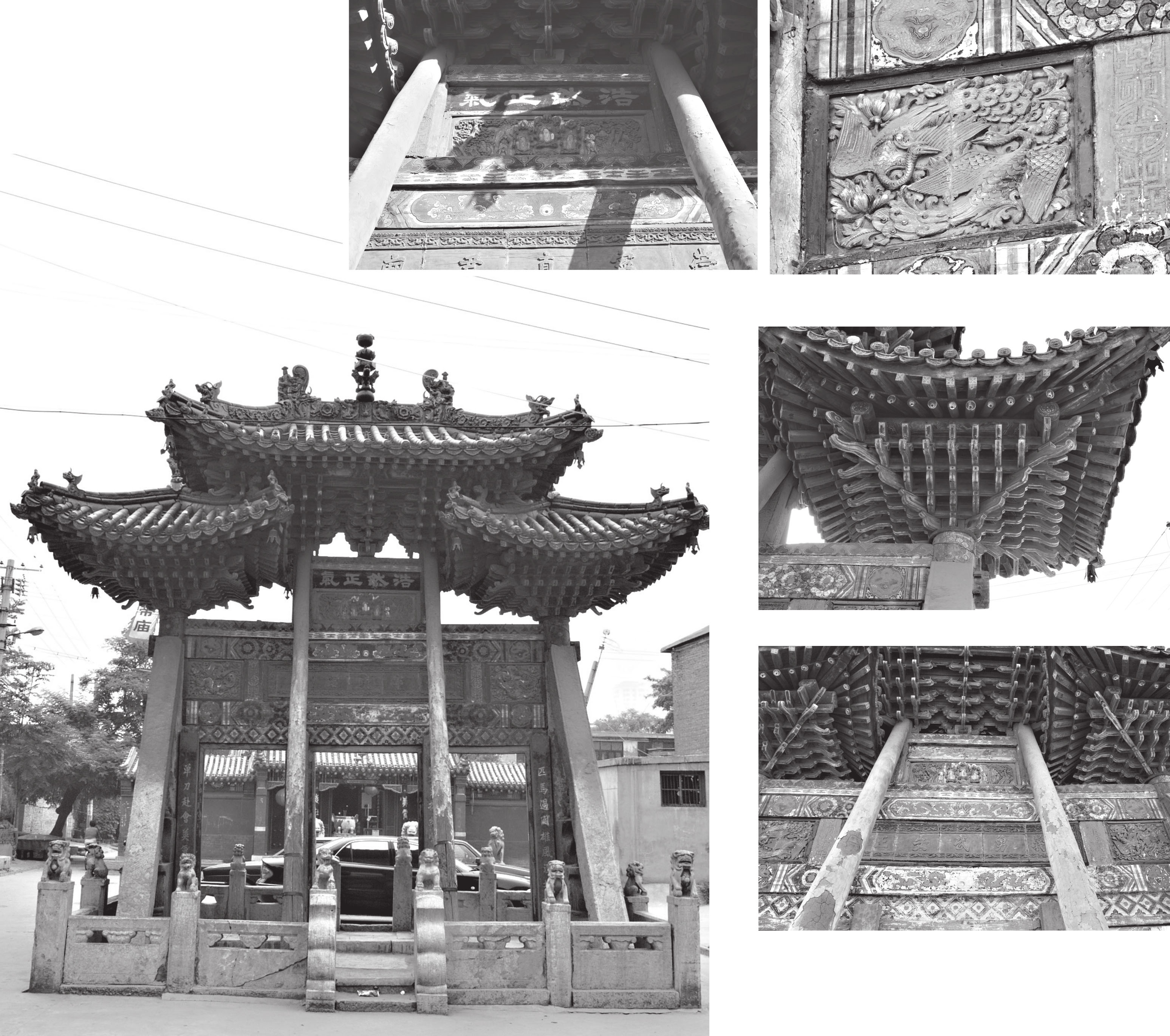 崇宁真君庙牌楼以牌楼石栏板为界,东西6. 45米,南北5.5米,四周石栏板向外延伸l米。牌楼为四柱三间三楼琉璃顶,明间为歇山顶,两次间为钻山顶,顶皆单檐,檐下为五步斗拱。下施有石栏,夹杆石为抱鼓,上置石狮,戗杆为木质,明间为庑殿顶,边楼为攒尖顶。明间檐下施有十一踩如意斗拱,边楼斗拱为九踩。木额枋前后有八个大字,前面为“浩然正气”,背面为“山西夫子”,下额枋为琉璃砖镶嵌,正面额枋是琉璃雕字“崇宁真君庙”,背面为“义勇武安王”。额枋之间用琉璃烧制的人物山水图像镶嵌,牌楼四周用石雕荷叶栏板,狮子头望挂围绕前后正中开门,牌楼下部用四根方石柱支撑,石柱南北阴刻楹联方石挂南北,用圆木柱、方石柱斜撑。在牌楼四角的护柱下有四组石雕狮,每组两尊,一上一下。牌楼平面柱为“一”字式,牌楼为原“关帝庙”整体建筑中最南面的一座单体建筑,各部件现保存完整,但整体已向西倾斜10厘米左右。