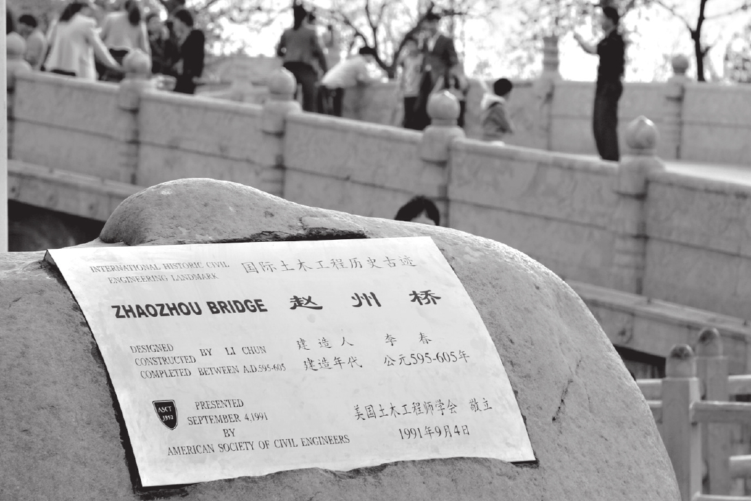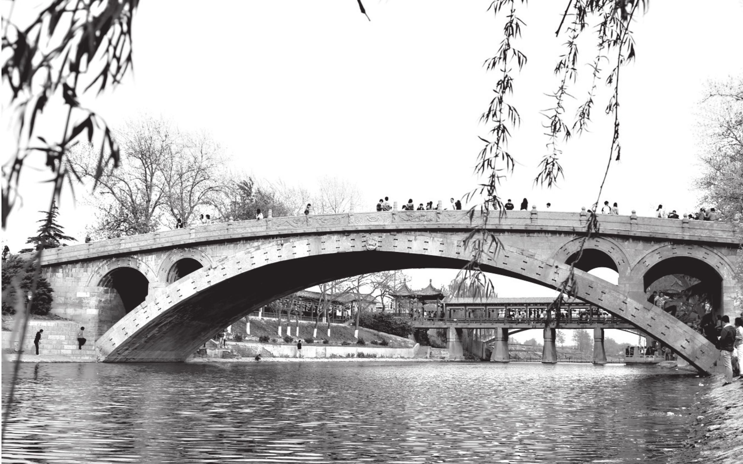 赵县安济桥,意为“安渡济民”,位于河北省赵县洨河上,也称赵州桥。被誉为“华北四宝之一”,是当今世界上现存最早、保存最完善的古代敞肩石拱桥,建于隋开皇至大业年间(公元595—616),桥长64.4米,顶宽9米,桥高8.65米,桥拱由28道拱券纵向并列而成,跨度37.02米。主拱上两端各有两个小拱,跨度分别为3.81米和2.85米。由工匠李春设计建造。据世界桥梁建筑专家的考证,像这样的敞肩拱桥,欧洲比我国晚了一千二百多年。赵州桥建成至今已近1 400年,经历了10多次洪灾,8次战乱和多次地震(其中1966年邢台7.6级地震震中距离赵州桥只有40多公里),依然屹立不倒,不得不说是一个“奇迹”。