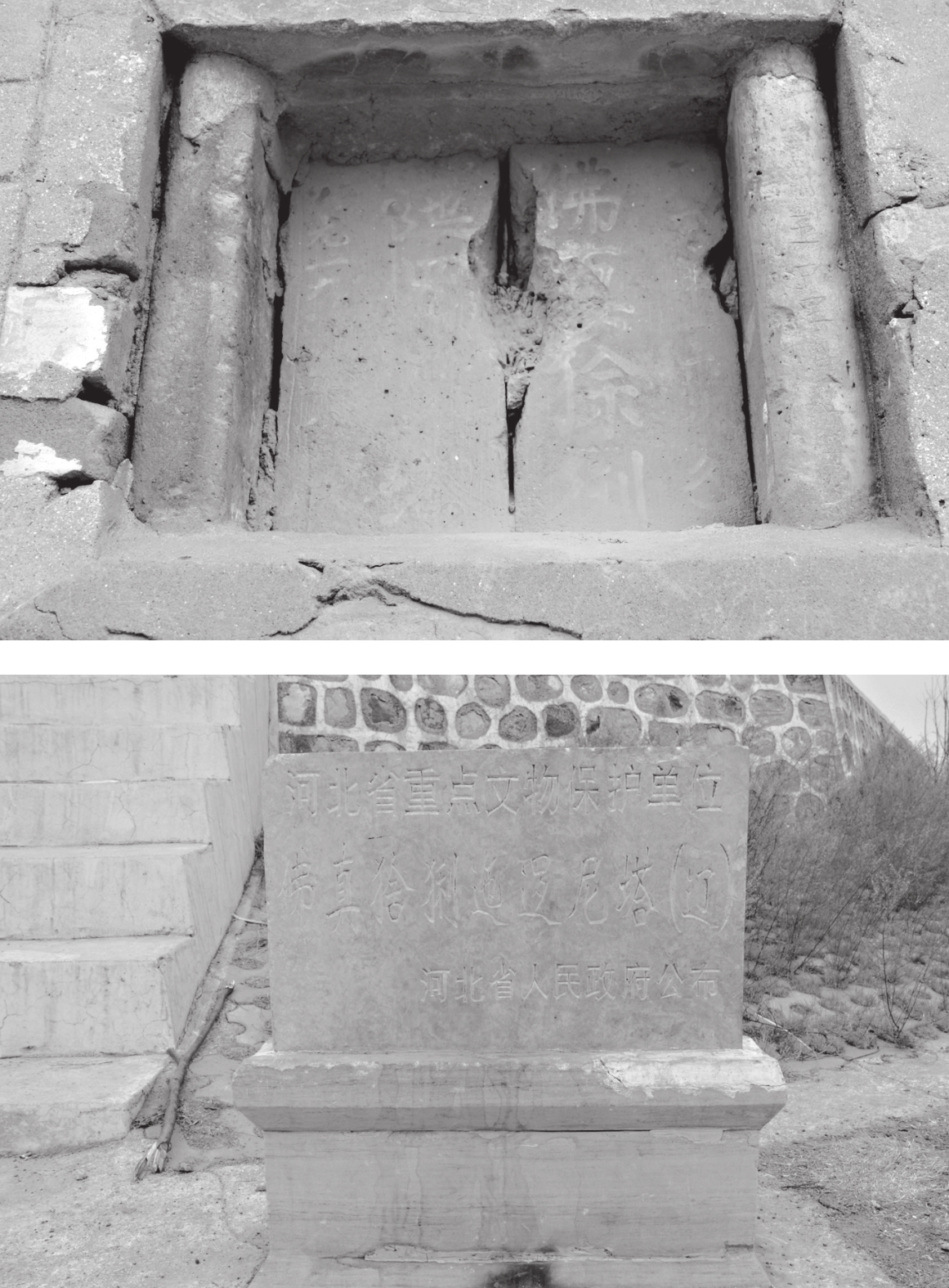 塔身镌文全名为“佛真猞猁迤罗尼塔”,塔基为六角形石台墩,台墩高1.9米,周长33米,整座塔为砖雕正椽、斗拱等仿木结构建筑。塔基的南面有七级石阶通塔基面,在塔的南面靠下方镶嵌方砖一块,镌刻阳文:“佛真猞猁迤逻尼塔”和“维天庆七年岁次”字样,现基本保存完整。