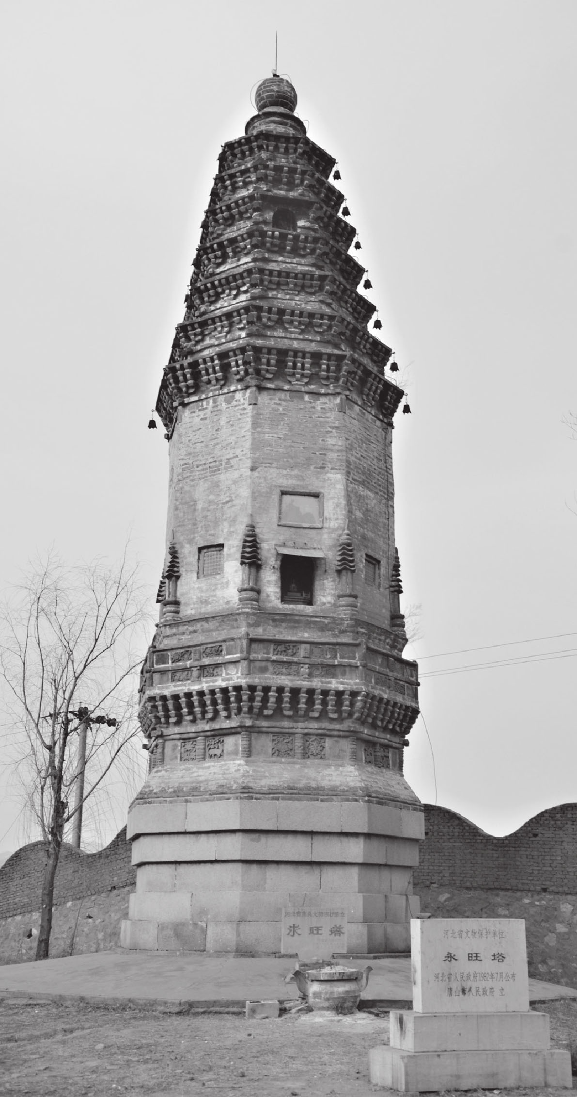 永旺塔位于河北省遵化市马兰峪村,塔平面呈八角形,八层高,密檐实心结构,明代万历年间(公元1563—1620年)由戚继光主持修建的。塔由塔基、塔身、塔刹三部分组成,总高17米,塔基分上下两层,下层用方石砌成基底,上层为须弥座,其上施斗拱承平座。束腰32个壶门有间柱相隔且均有砖雕。座上为砖雕斗拱出檐,檐上第一层塔身高约6米,在塔身8个转角处各建一座小塔,造型与主塔相似,一半露于外面,一半嵌入塔身,与主塔浑然一体。塔身八面均有假窗,南北两面有砖券假门,门内雕有佛像。北面门上嵌砌石质匾记,刻有“永旺塔”3字。第二层塔身高约6米,八角均做塔柱,叠涩出檐,每层的8个角均悬挂风铎。塔刹以宝珠封顶。北门之上有碑记,上款刻写“钦差总理练兵事务兼镇守蓟州永平、山海等地方总兵官、少保兼太子太保、中军都督府左都督、定远戚继光”,下款为“岁万历十年仲秋吉日立”。该塔为河北省重点文物保护单位。