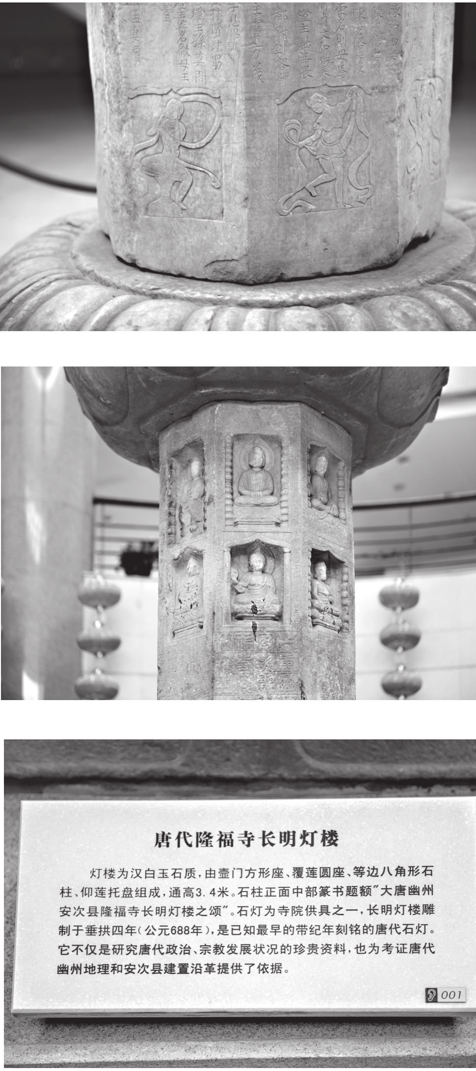 安次隆福寺长明灯楼(塔)位于河北省廊坊市安次区北史家务乡古县村西南,建于唐垂拱四年(公元688年)。灯楼为汉白玉石质,现存高3.4米。方形基石上雕覆莲座,八棱柱身,柱上施仰莲托盘。它是国内现存最早的“灯幢合体”实例,也是目前已知纪年最早、雕刻内容最丰富、保存状况较好的石灯楼,现存于廊坊博物馆,为国家一级文物,史料价值极高,在唐代石灯楼中绝无仅有。