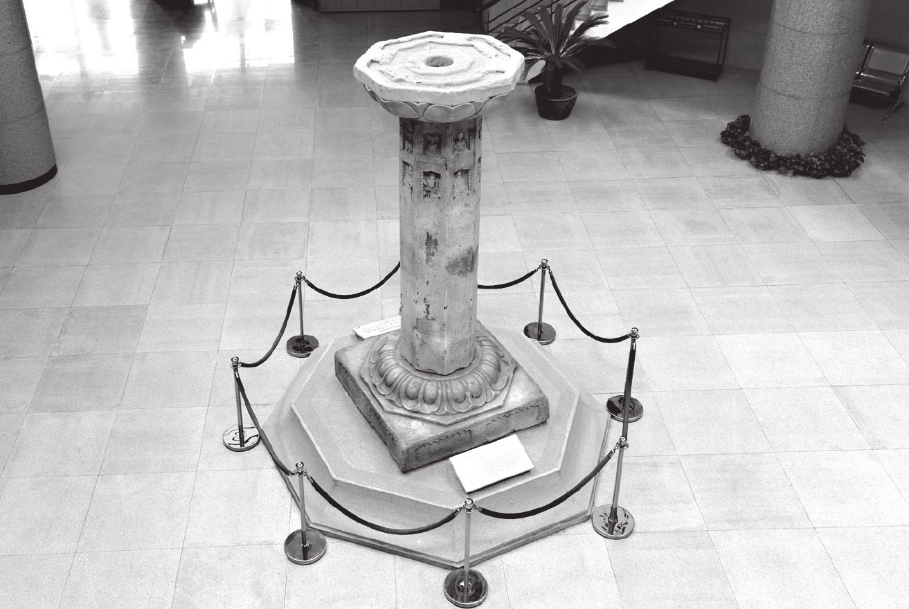 方形基石上雕覆莲座,座上立八棱柱身,柱上施仰莲托盘,灯室已失。柱身所刻内容除颂文和建造年代外,还刻有《般若波罗蜜多心经》及建造人姓名。柱上部各面刻尖拱龛,内雕坐佛。