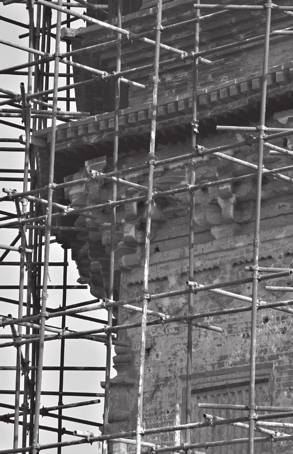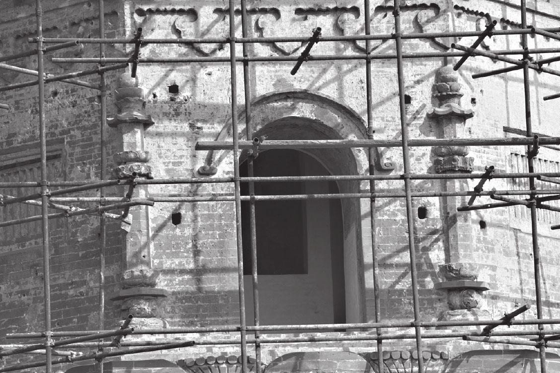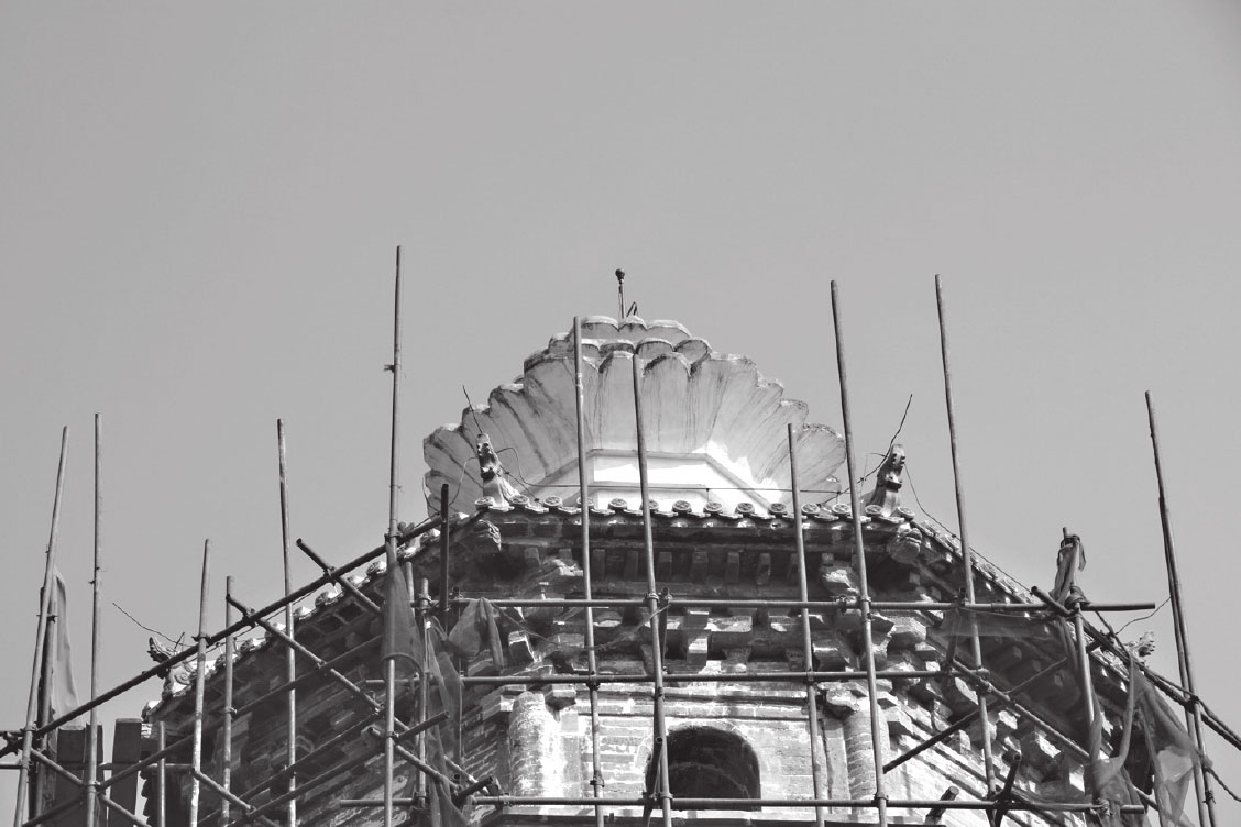 西岗塔位于河北省涞水县城西约一公里的西岗上。塔原名已佚,因建于西岗上,故俗称西岗塔。该塔建于辽、金时期,平面呈八角形,为十三层密檐楼阁式砖塔,通高 36 米,须弥座式基座,下面有八角形砖砌台基。塔身的四个正向辟拱形券门,余四面做扁方形直棱假窗。塔的内部结构为双层套筒式,由塔壁和塔心柱构成八角形环形回廊,楼梯置于回廊和砖柱之中,从塔身可旋至塔顶。塔身之上除第一层施木制檐椽及砖制飞椽外,其他均为砖制。第二层至第十二层檐距相等,出檐长度逐层递减。均用叠涩方法向外砌出七层,代替斗拱檐椽。各层檐转角处用木质角梁,悬挂风铎。第十二至第十三层檐距较高,正向四面辟有拱形券门。八角各施圆倚柱,下置覆盆式柱础。柱上承托普柏枋、斗拱,斗拱形制除补间铺作外,其余均与第一层相同,只是材分略小。第十三层檐顶部用布瓦做成八角攒尖式屋面,施有脊兽。攒尖部位置塔刹,现大部分己毁,仅留八角形基座及部分受花。