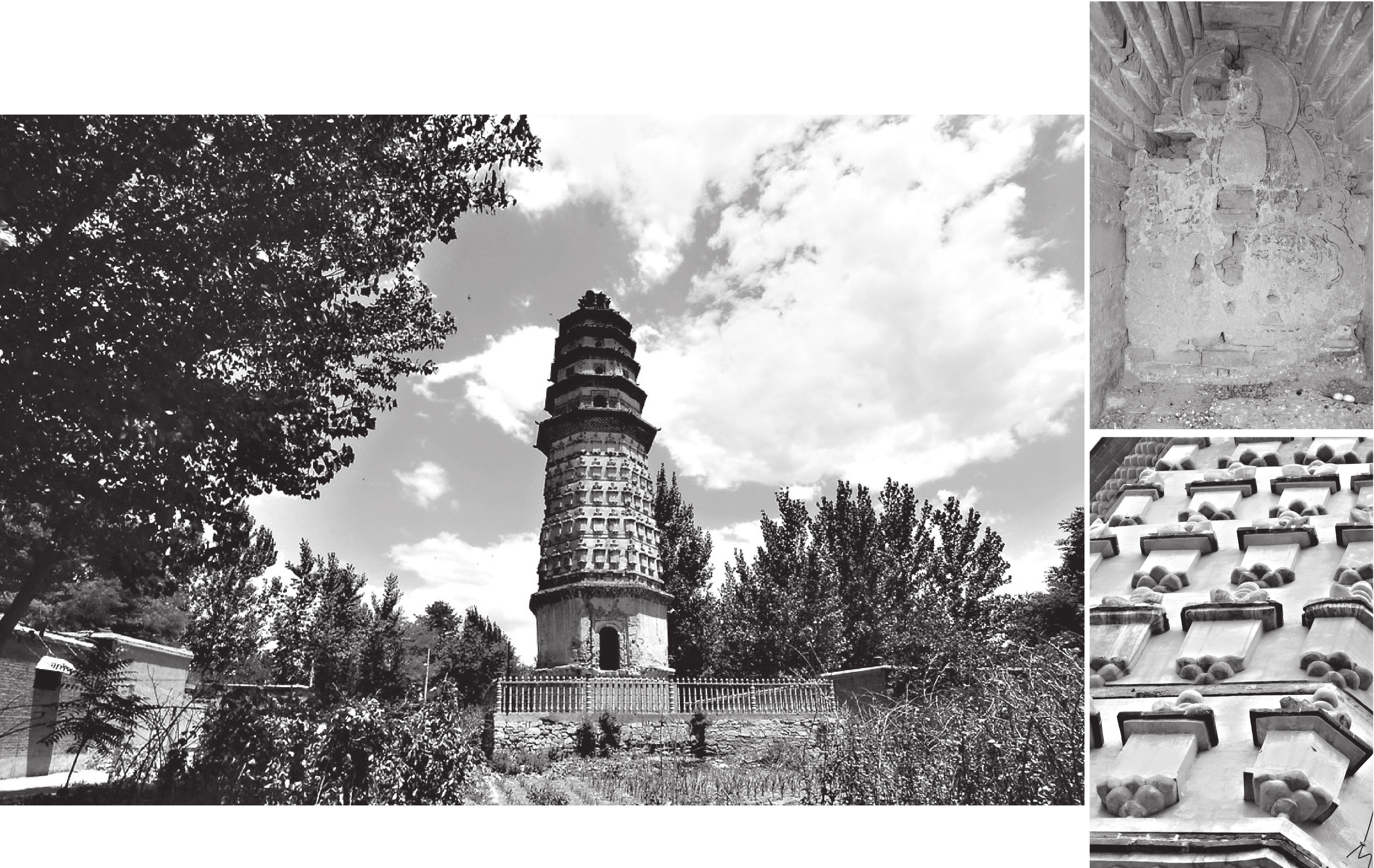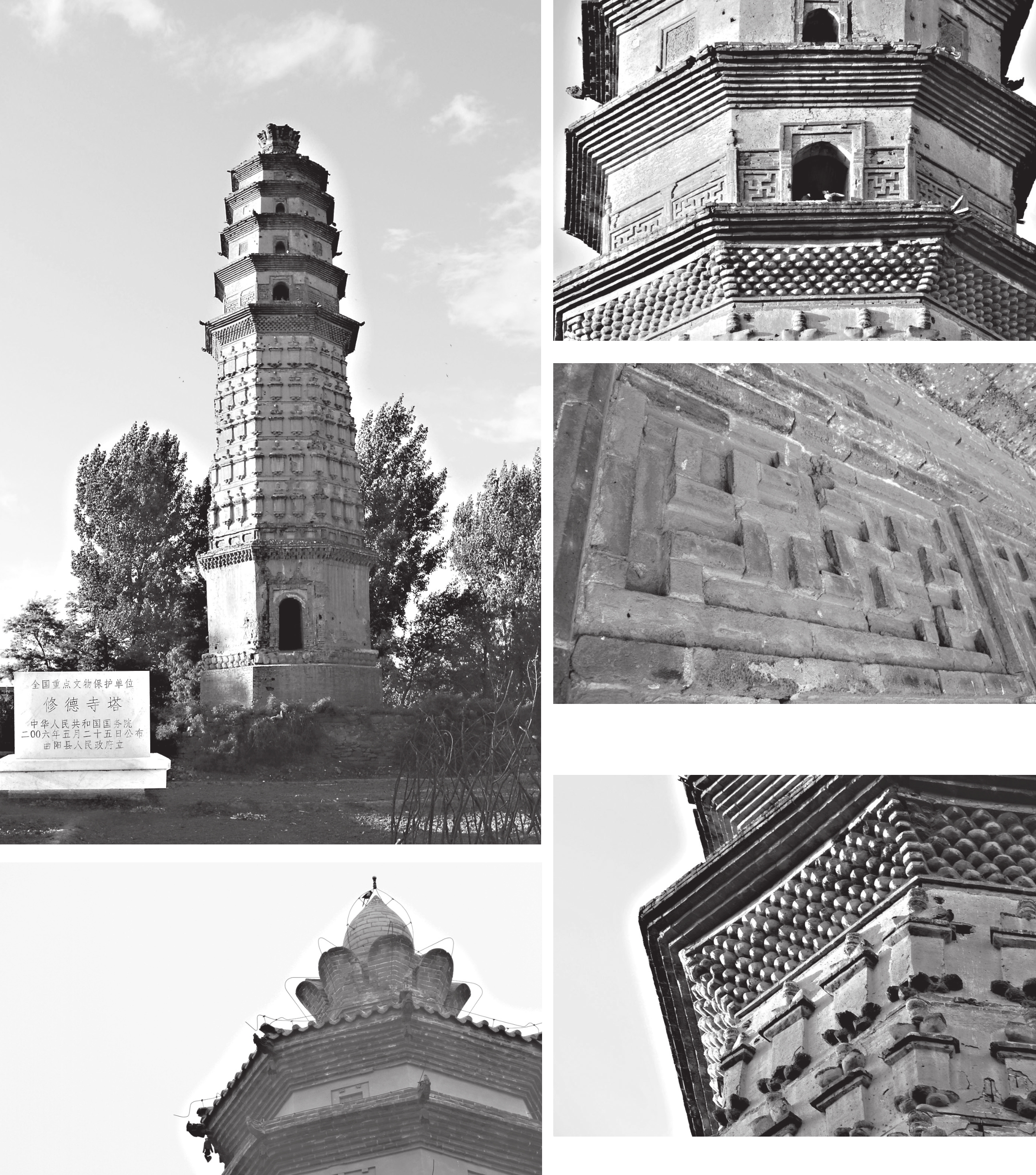 修德寺塔为阁楼式砖塔,平面八角,高32米。塔坐于方形台基上,下部为塔座,座下部分现为墙体所掩,座顶为砖雕仰莲二层,座上6级塔身。首层塔身正面辟门,内有塔心室。二层为实心塔身,坐于壶门平座上,塔身上塑五层小佛塔,每层24个,共120个,小塔造型一致,均于双层莲瓣上起方形塔身一级,叠涩顶,山蕉宝珠为刹。第三至第六层塔身构造基本相同,均于南面辟券门,其他各面做盲窗,是否有塔室不详。第一层塔顶为三层莲瓣出檐,以叠砖为顶;第二层塔身有双层塔檐,下层为7层雕砖莲瓣,其上又做叠涩出檐、收分,做法独特,从此处可推断第二层塔檐以上为后加塔级,上下非同一时期文物。第三至第五层均为叠涩出檐、收分,顶层以叠涩出檐,以灰筒板瓦做顶,顶上砖砌山蕉,上部塔刹无存。