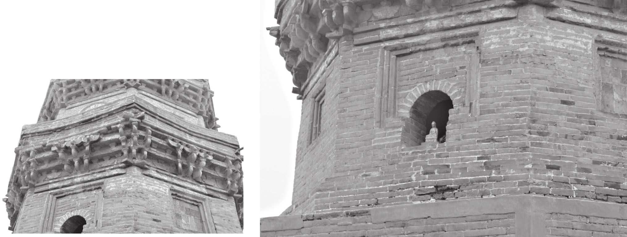 普彤塔为八角形实心砖塔,共9级,塔高33米,底层直径5米,塔身每级出檐,檐下翘置斗拱。塔的须弥座正南面有一门洞直至塔心,塔心下有一砖井,砖井东、西、北三面之上分坐石佛3尊,这种佛龛营造方式,实属罕见。