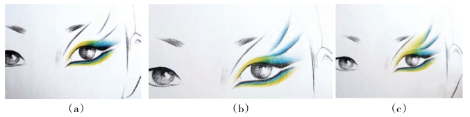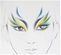 首先是构思,以眼部位置为中心夸张眼形。其次围绕眼形加强装饰线的布局,根据眼部周边的凹凸结构衬托眼形、妆形的美感。最后将眼影、腮红、口红着色,完成彩绘化妆的效果图。