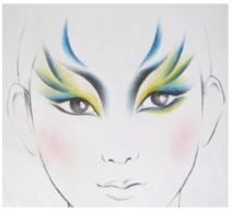运用相对的直线、斜线,在眼部及面部结构中,完成妆面设计。线条组合的图形既能装饰妆面,又能使眼形、眉形得到夸张和延伸。