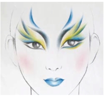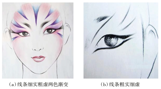 (2)妆形:在妆面中根据妆形不同可以使用相对的垂直线、斜线、水平线完成直线妆形。但两线条排列尽量不要交叉应用,避免妆面杂乱、不和谐。线条绘画舒展流畅,不要过于生硬,注意深浅变化,虚实自然。