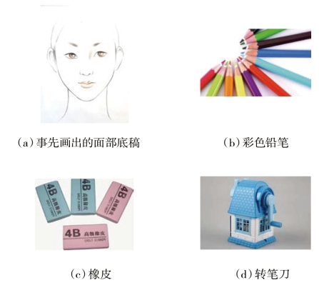 事先画出面部底稿,复印多份待用,准备彩色铅笔、橡皮、转笔刀。(如图1-1-1所示)