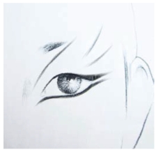 由于眉尾部位线条的设计,眉毛不易画得过长,因此只强调眉头部位。眉头下压连贯鼻侧,与内眼窝形成明显的分界线。眉头部位完成后,直接延伸到鼻侧,完成鼻侧影。